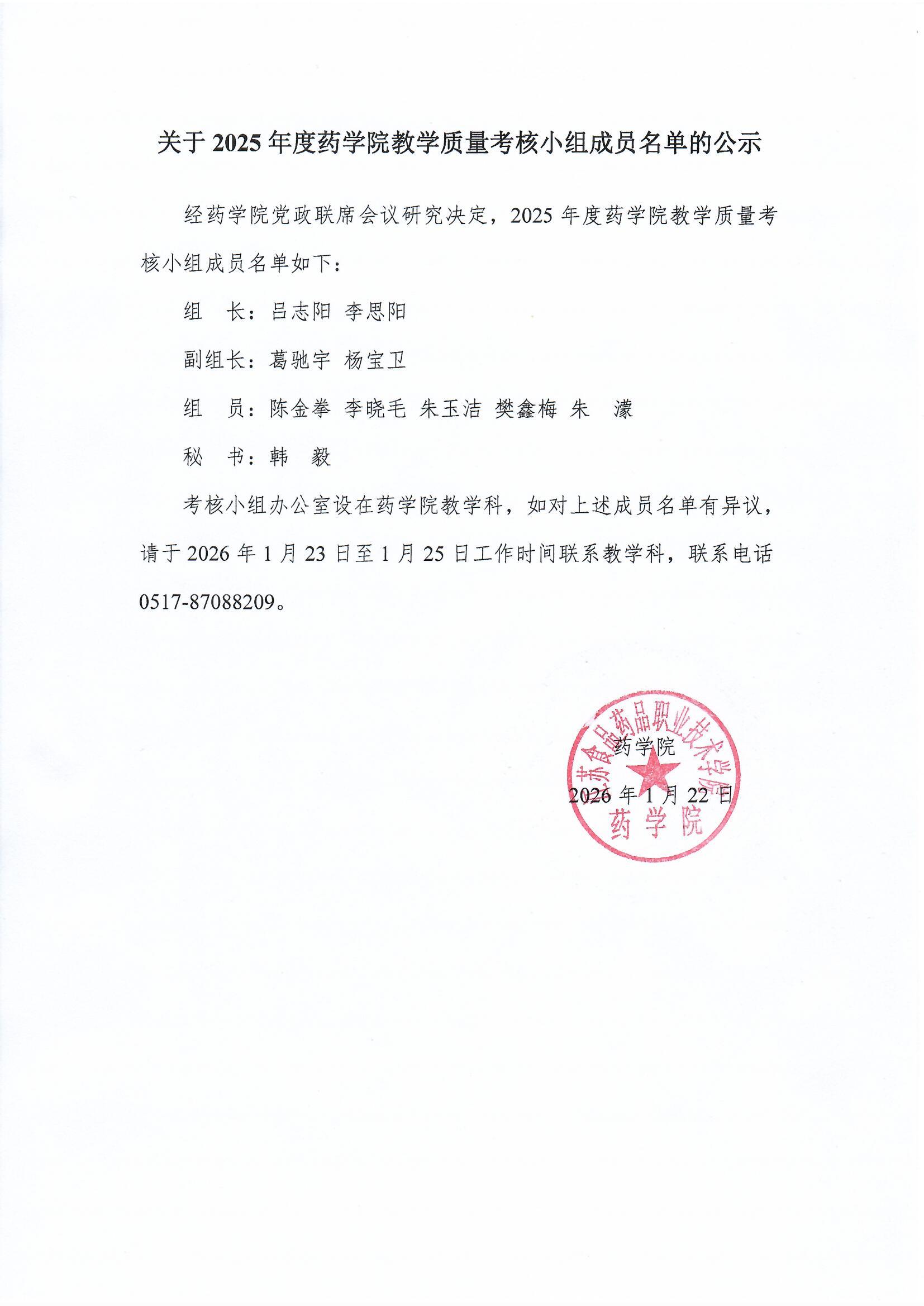 关于2025年度药学院教学质量考核小组成员名单的公示