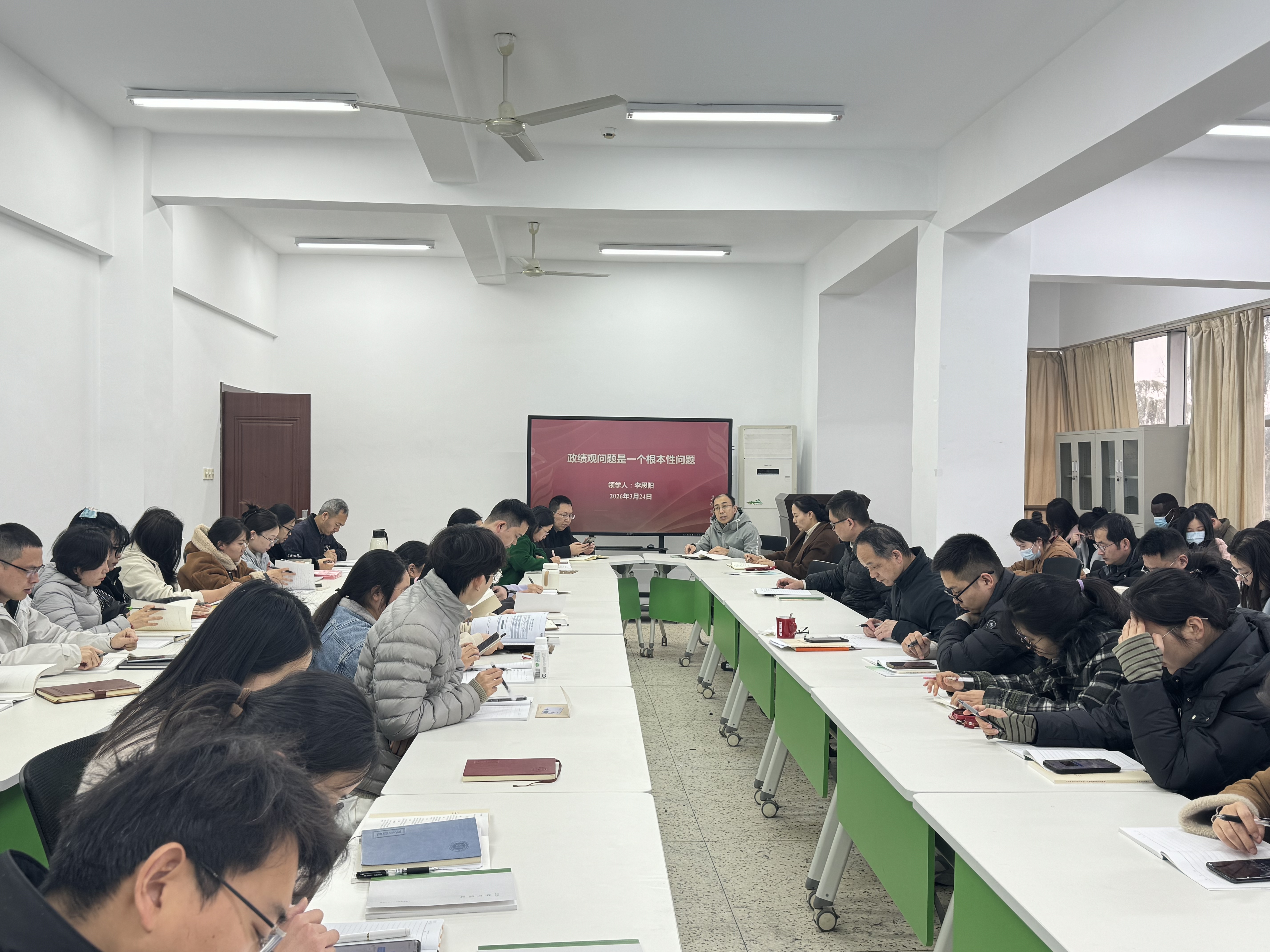 3月24日,药学院全体教职工在会议室开展“政绩观问题是一个根本性问题”的集中学习。会议由党总支书记李思阳主持并领学。